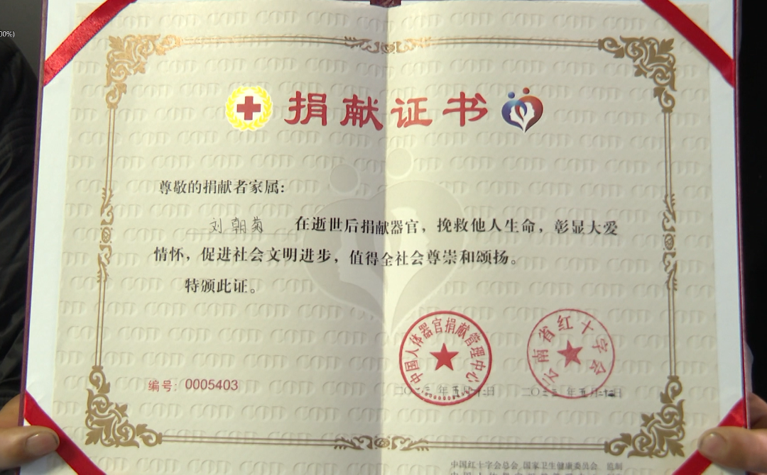 5月22日上午,在红十字会人体器官捐献协调员见证下,在大理州人民医院手术室里,经过3个多小时的紧张手术,捐献者刘朝菊的2个肝段、1对肾脏及1对眼角膜顺利获取。
