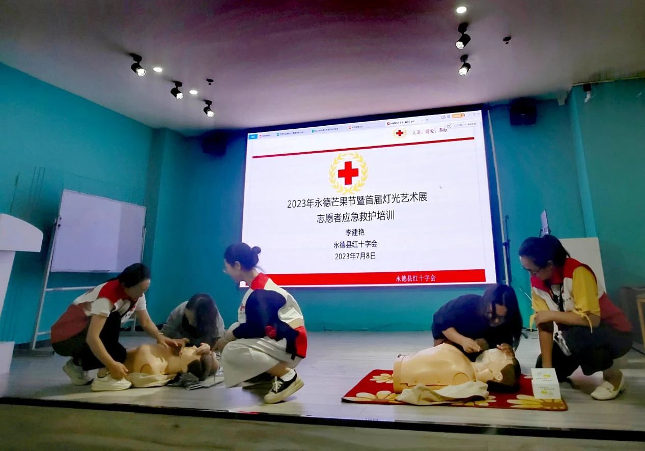 7月8日,永德县红十字会联合团县委在新时代文明实践中心,对2023年芒果节暨首届灯光艺术展志愿者开展应急救护知识培训,提升志愿者应急能力,护航全县重要活动安全。