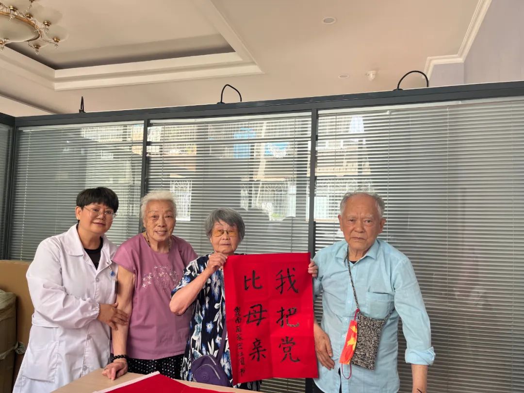 活动开始,全体党员干部与入住老党员一同面对鲜红的党旗,举起右手、紧握拳头,重温入党誓词,以铮铮誓言,表达坚定不移听党话、跟党走,薪火相传、持续奋斗的信心和决心。活动中,全体党员认真学习《习近平新时代中国特色社会主义思想学习纲要》——“以中国式现代化全面推进中华民族伟大复兴”章节,进一步感悟思想伟力,强化党性教育,坚定奋斗信心。通过观看党员教育宣传片--《信仰》,进一步强化了全体党员对中国共产党为什么能,中国特色社会主义为什么好,归根到底是因为马克思主义行的深刻认识。全体党员干部和入住老党员立足工作职责及自身实际,结合贯彻落实党的二十大精神和主题教育,就如何在今后的工作中进一步发挥好党组织的战斗堡垒作用和党员的模范表率作用开展深入交流。入住老党员代表表示:“此次主题党日活动开展得非常好,让大家深切感受到了党的温暖和公寓的关心关爱。虽然退休了,但作为一个共产党员只要生命尚存,党性就永远没有终点,共产主义信仰就永远不会改变”。公寓党员干部一致表示:“通过此次主题党日,进一步坚定了政治信仰,激发了党员干部干事创业的责任感、使命感、荣誉感,将不忘初心使命,切实服务好全体入住老人。”活动最后,全体党员干部认真落实“我为群众办实事”要求,与入住老人一起以“我为夕阳绘蓝图”为主题,组织老师为入住老人中的书画爱好者进行辅导,从中汲取创作素材,现场创作了书法书画等融合传统文化与美好祝福的美术作品,赠送给公寓的入住老人。用书法、绘画等形式展现党员的精神风貌,在宣传弘扬传统文化的同时,进而展现出心中的爱党爱国情怀,切实把党对老年人的关心关爱和老年人对党的感恩紧密结合起来。