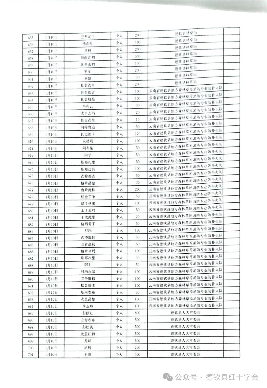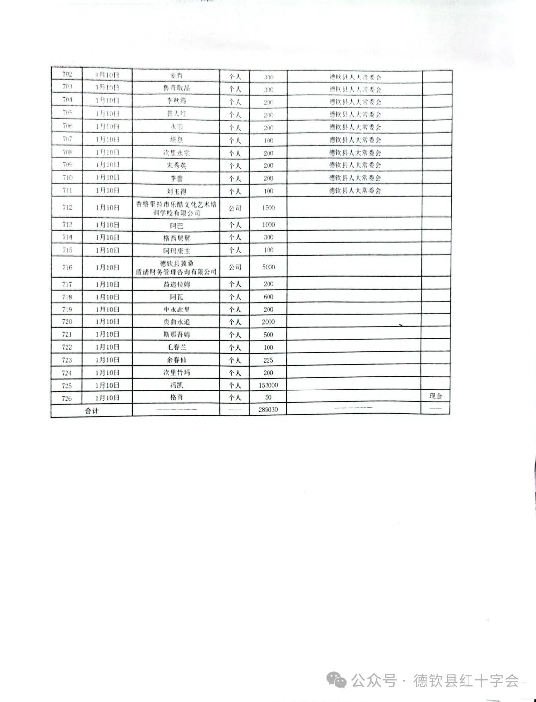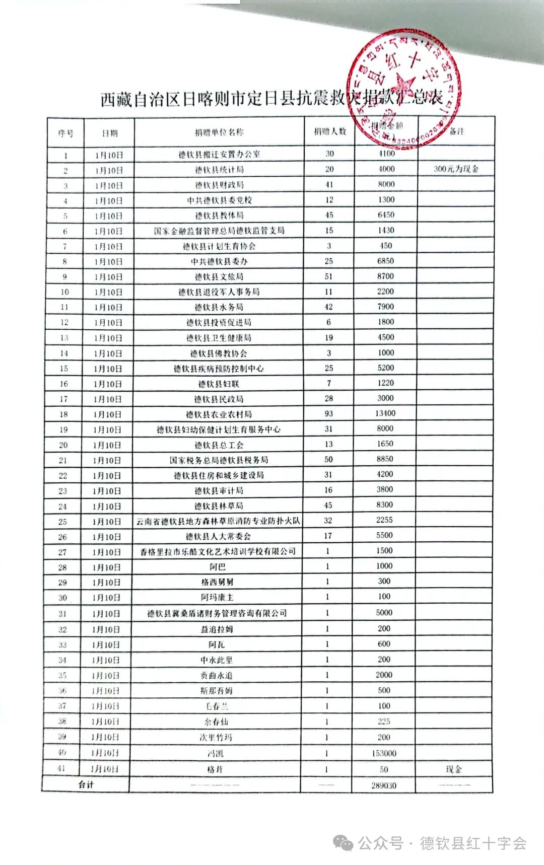 来源: 作者: 编辑:德钦县 日期:2025-01-11 点击率:82 [关闭] 2025 年 1 月 7 日,西藏自治区日喀则市定日县突发 6.8 级地震,造成了重大人员伤亡与财产损失。灾难发生后,德钦县红十字会紧急响应,迅速在全县发起抗震救灾募捐活动。2025 年 1 月 10 日 当天有28家单位,2家爱心企业,共726 名爱心人士参与捐款,募捐资金合计 289030 元。现将所接收的募捐资金进行公示,接受各级各部门及社会各界的监督。 若对以上公示有疑问,请致电德钦县红十字会业务股咨询反馈。附件1:西藏自治区日喀则市定日县抗震救灾捐款汇总表附件2:西藏自治区日喀则市定日县抗震救灾捐款明细表
