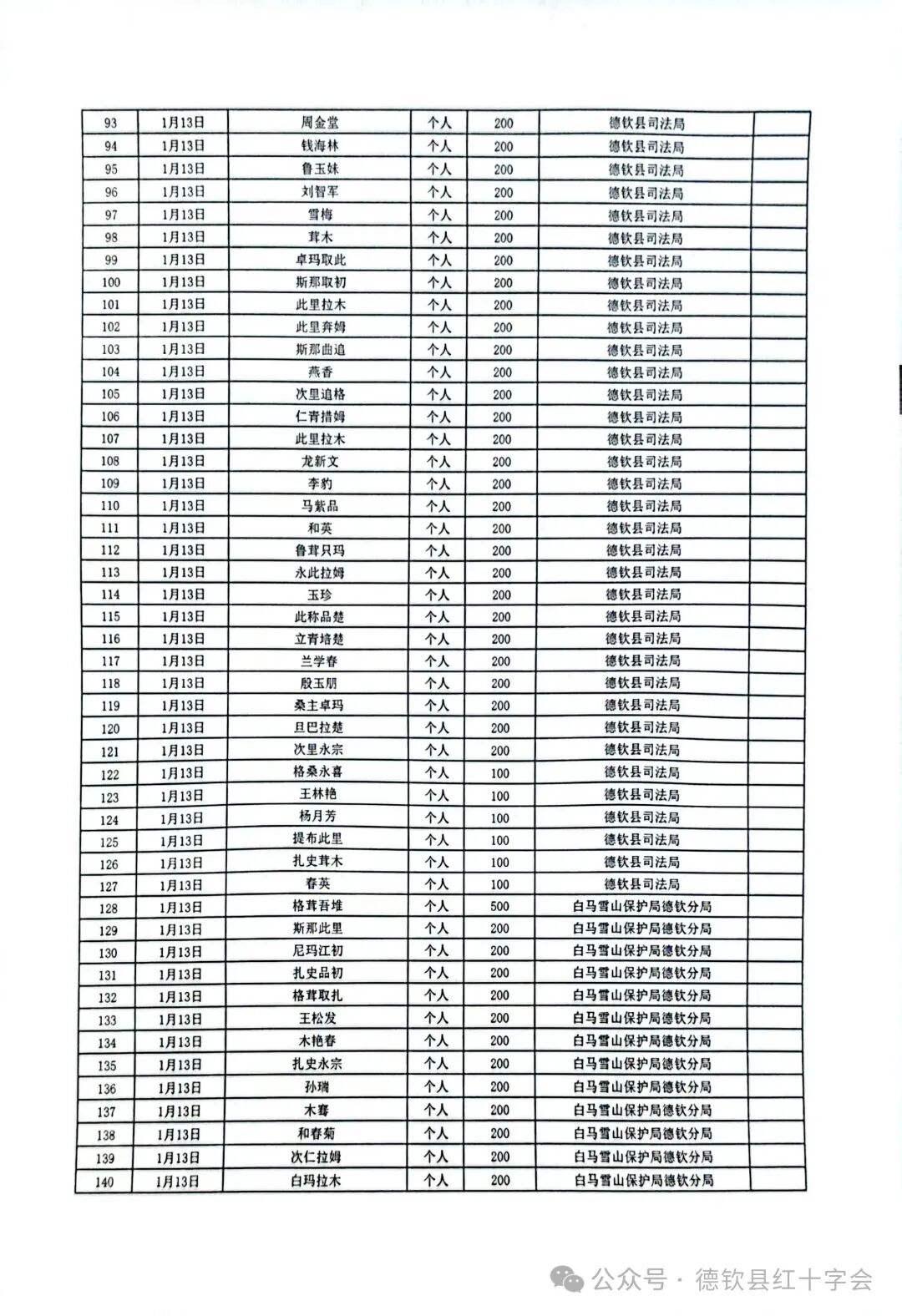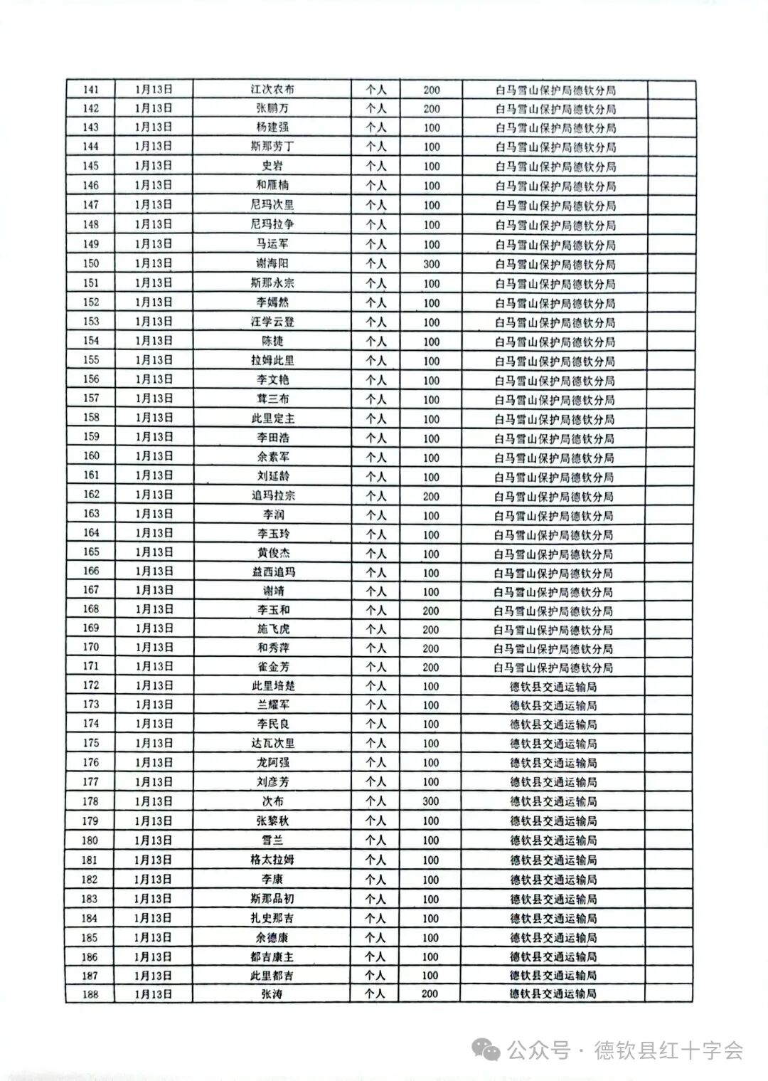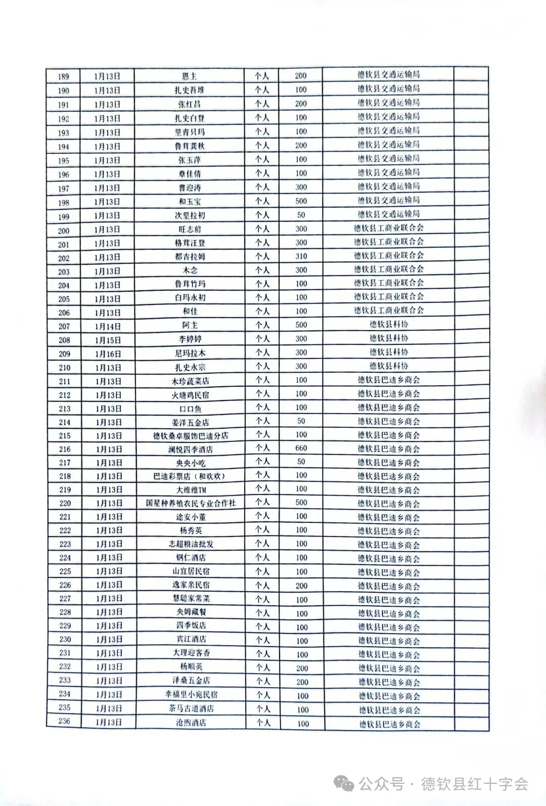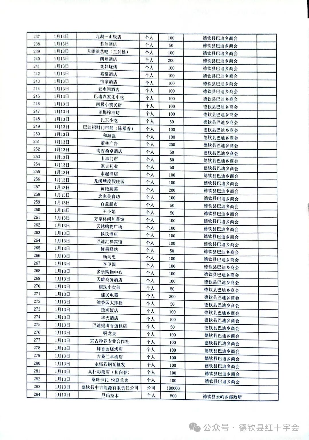 来源: 作者: 编辑:德钦县 日期:2025-01-14 点击率:63 [关闭] 2025 年 1 月 7 日,西藏自治区日喀则市定日县突发 6.8 级地震,造成了重大人员伤亡与财产损失。灾难发生后,德钦县红十字会紧急响应,迅速在全县发起抗震救灾募捐活动。2025年1月13日当天,有9家单位,1家企业,1家商会,共286名爱心人士参与捐款,募捐资金合计 145591 元。现将所接收的募捐资金进行公示,接受各级各部门及社会各界的监督。 若对以上公示有疑问,请致电德钦县红十字会业务股咨询反馈。附件1:西藏自治区日喀则市定日县抗震救灾捐款汇总表附件2:西藏自治区日喀则市定日县抗震救灾捐款明细表