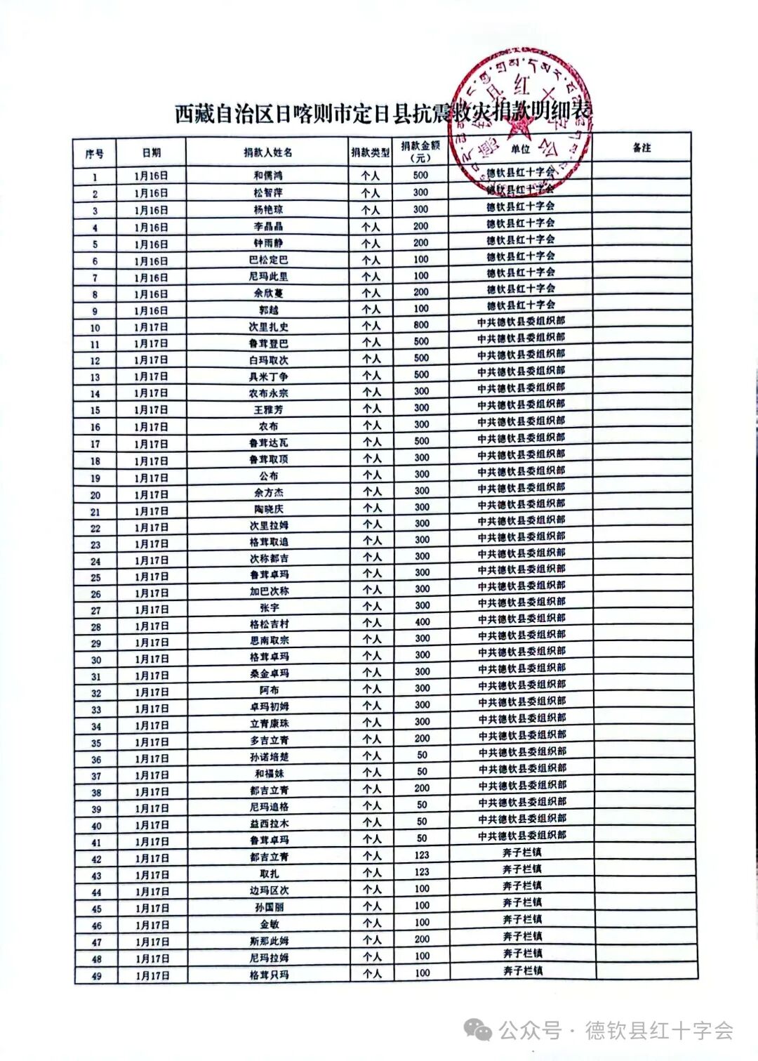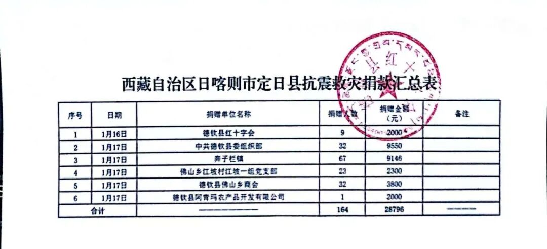 西藏自治区日喀则市定日县抗震救灾捐款情况公示(第七期)