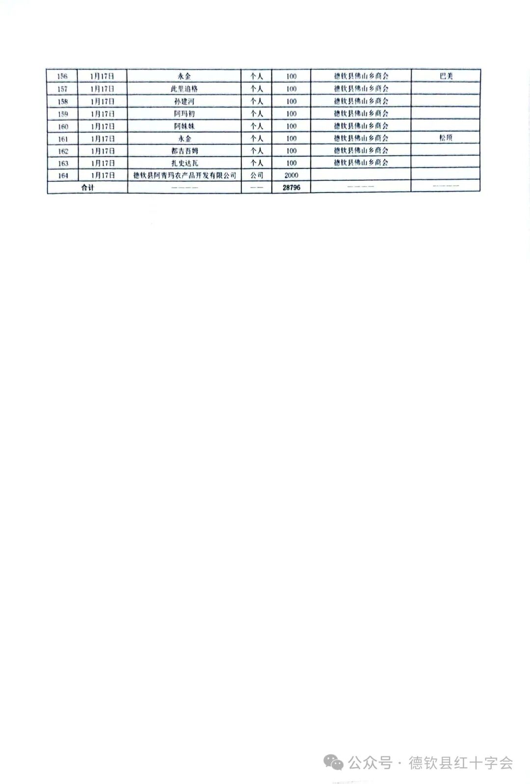 来源: 作者: 编辑:德钦县 日期:2025-01-17 点击率:74 [关闭] 2025 年 1 月 7 日,西藏自治区日喀则市定日县突发 6.8 级地震,造成了重大人员伤亡与财产损失。灾难发生后,德钦县红十字会紧急响应,迅速在全县发起抗震救灾募捐活动。2025年1月16日-1月17日,有2家单位,1个乡镇,1个党支部,1家商会,1家公司,共164名爱心人士参与捐款,募捐资金合计28796元。现将所接收的募捐资金进行公示,接受各级各部门及社会各界的监督。 若对以上公示有疑问,请致电德钦县红十字会业务股咨询反馈。附件1:西藏自治区日喀则市定日县抗震救灾捐款汇总表附件2:西藏自治区日喀则市定日县抗震救灾捐款明细表