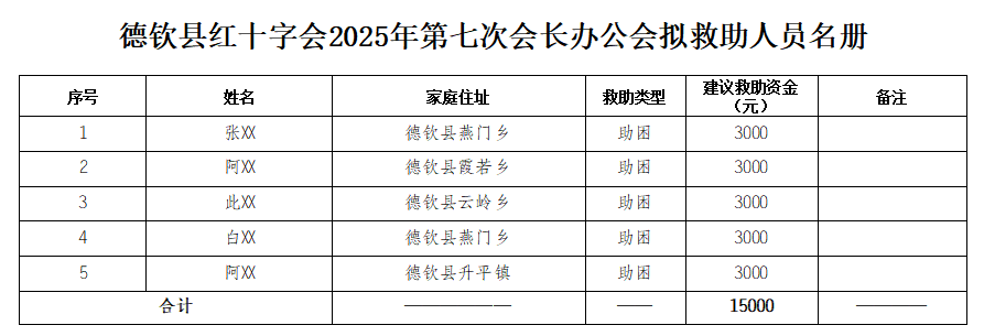 为发扬“人道 博爱 奉献”的红十字精神,着力改善德钦县弱势群体境况,根据《中华人民共和国红十字会法》、《中国红十字会章程》、《中国红十字会捐赠工作管理办法》和《德钦县红十字会人道救助实施办法》(试行),充分发挥红十字人道救助能力,德钦县红十字会对人道救助申请进行了审核,经德钦县红十字会2025年第七次会长办公会研究拟对下列人员给予救助,根据公开、公平、公正的原则,为提高工作透明度和救助的准确性,现将拟救助的人员名单进行公示,接受社会监督。