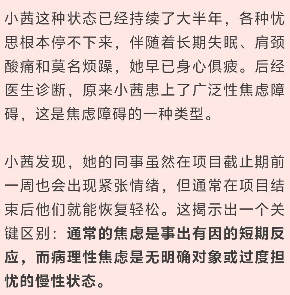 深夜,28岁的小茜躺在床上,脑海里的念头一个接一个地蹦出来。“明天的提案,客户会不会否定?”“父母最近体检,结果好像有点问题……”这些念头此起彼伏,尽管她试图转移注意力,但她依然心跳加速、肌肉紧绷,直到凌晨两三时才迷迷糊糊入睡。