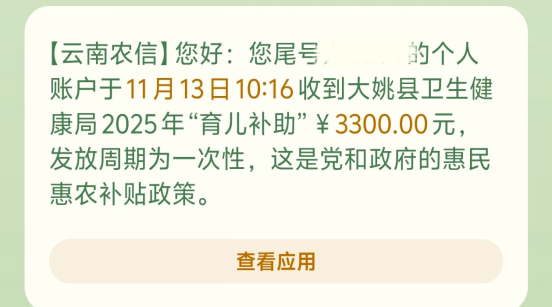 为积极响应国家生育支持政策,切实减轻县域内家庭育儿负担,大姚县3岁以下婴幼儿育儿补贴工作已全面推进,第一批补贴资金于11月13日正式发放,让全县符合条件的家庭率先享受到政策红利。