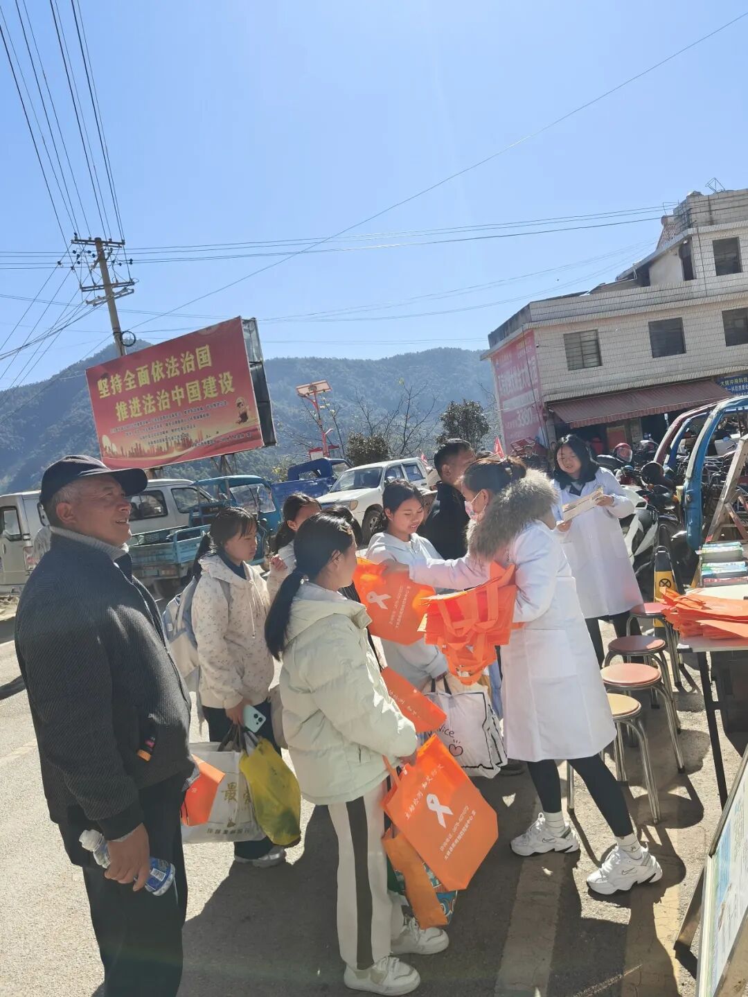 进乡村:各乡镇依托集市街天、进村入户等形式,悬挂宣传标语、摆放展板53块,播放宣传标语36条,发放宣传折页3.6万份、手提袋7000余个,覆盖群众5万余人,将防艾知识送到群众“家门口”。