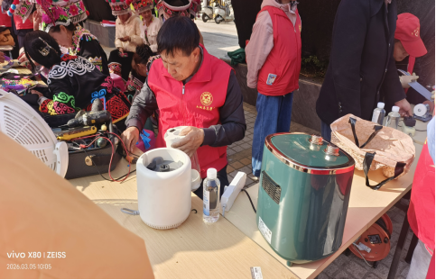广场一角,养老志愿服务队聚焦老年群体日常生活需求,开展义剪、小家电维修、磨菜刀、政策咨询等便民活动,把贴心服务送到老年人身边。