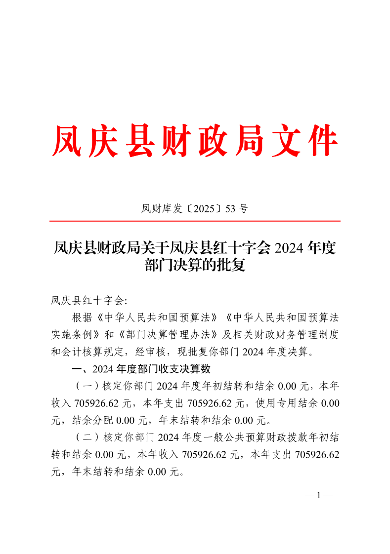 凤庆县财政局关于凤庆县红十字会2024年度部门决算的批复