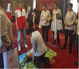 传讲座结束后,进行的应急救护员培训及应急救护普及培训活动上,市红十字会志愿者杨妍妩老师结合丽江旅游行业和酒店服务行业特点,从心肌梗死、脑出血、癫痫发作、昏迷的自救互救知识以及烧烫伤,外伤出血包扎,骨折固定搬运等方面进行了讲解,示范了心肺复苏,气道异物梗阻的自救互救技能。培训内容包括:救护新概念、心肺复苏术、创伤救护、意外伤害防护、自动体外除颤器(AED)使用等技能。