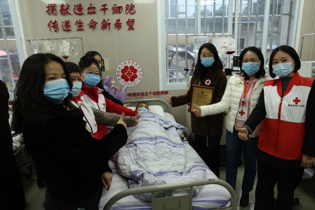 重庆市红十字会相关负责人到采集现场看望张先生,向他颁发捐献荣誉证书,感谢他“用大爱完成一次生命传递”。