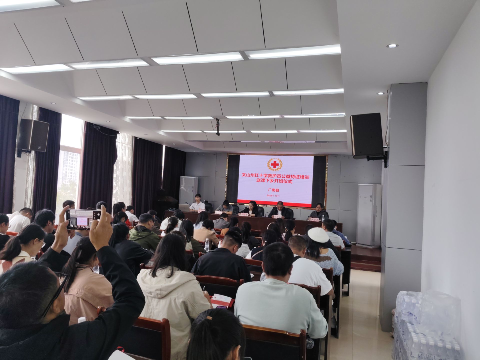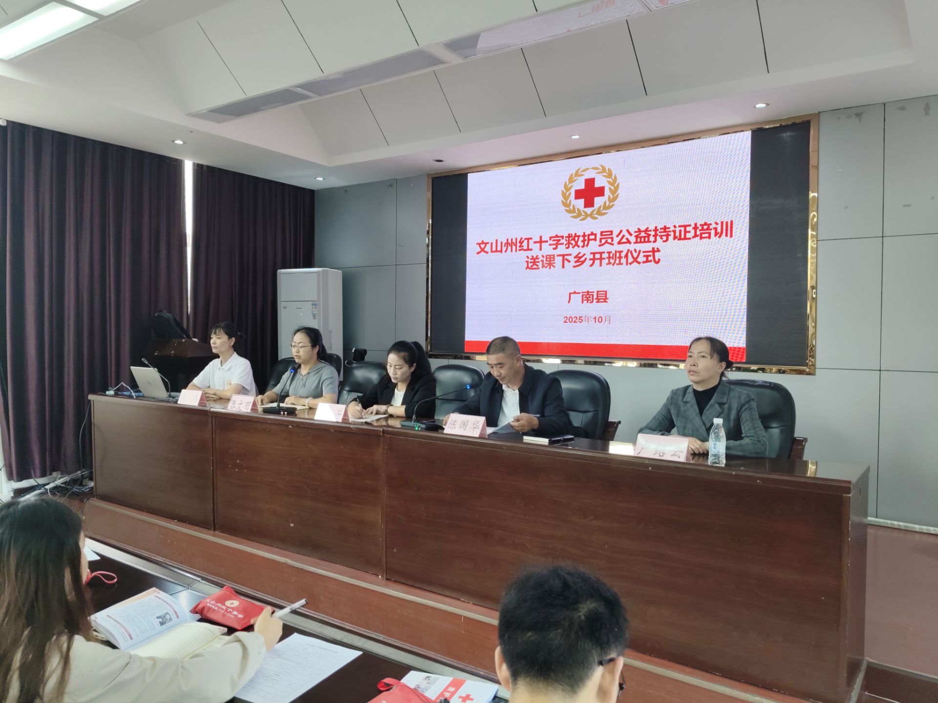 2025年10月16日,文山州红十字会应急救护标准化送课下乡暨广南县中小学校应急救护员培训班在县教育体育局举行开班仪式。州红十字会副会长李向芳在开班仪式上作动员讲话。州红十字会应急救护培训中心4名师资团队到场开展培训。