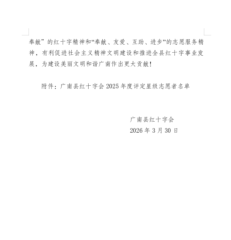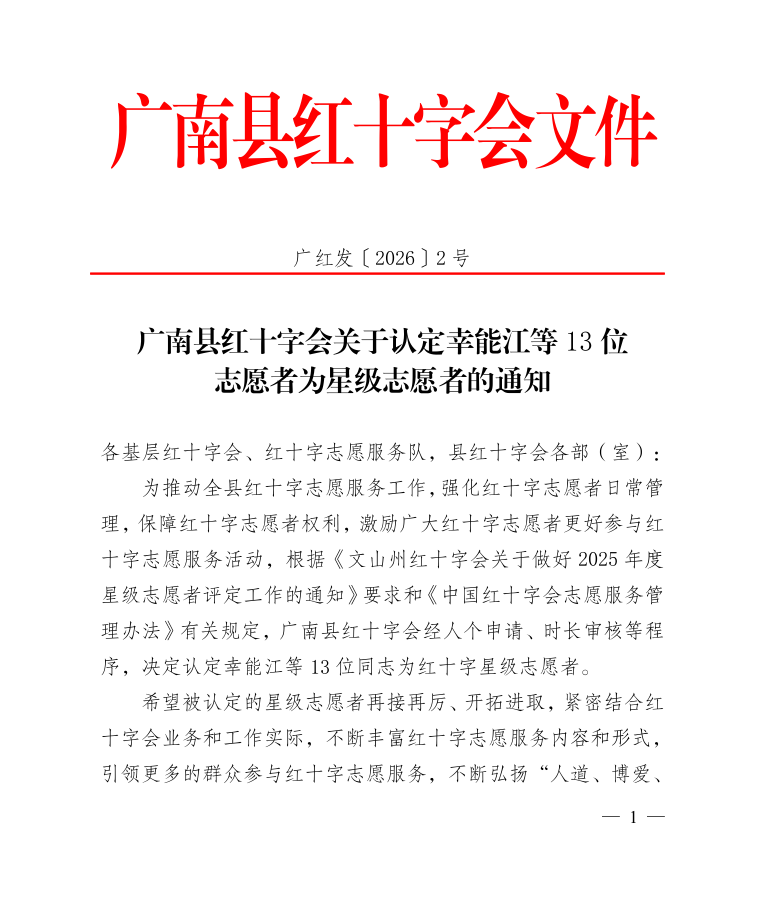 广南县红十字会关于认定幸能江等13位 志愿者为星级志愿者的通知