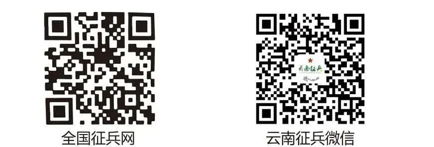 兵役登记和报名应征请扫描“全国征兵网”二维码,征兵相关咨询请关注“云南征兵”微信公众号。广大适龄青年朋友们,祖国在召唤你们,实现强军目标、建设世界一流军队需要你们,请立即行动起来,接受祖国挑选,用青春和热血为实现伟大的中国梦、强军梦贡献贡山力量!钢铁队伍期待你的加入!