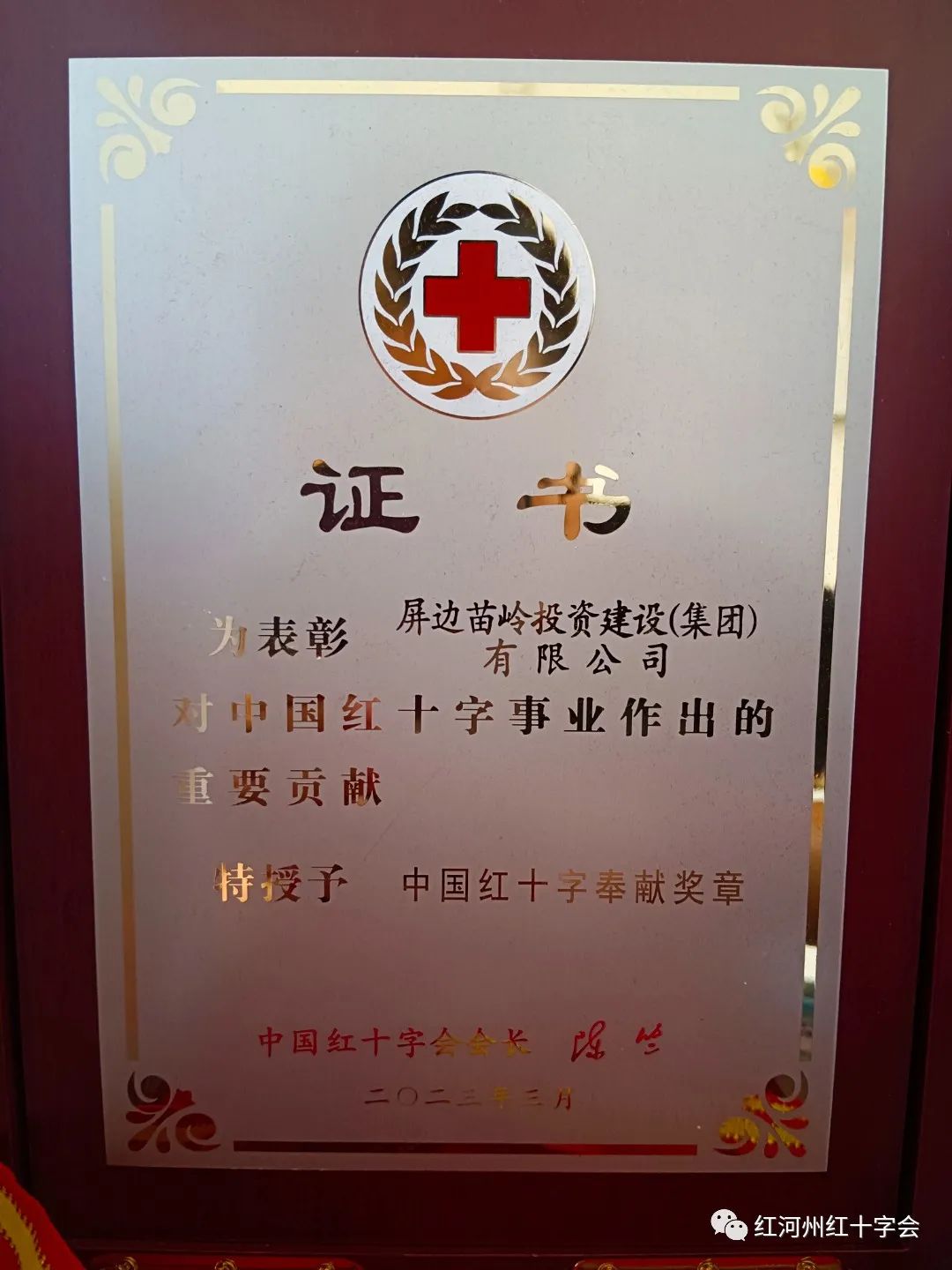 近日,屏边苗岭投资建设(集团)有限公司获得由中国红十字会总会授予的“中国红十字奉献奖章”,云南屏边黄麟厂有限责任公司获得由云南省红十字会授予的“博爱捐助”牌匾,旨在表彰两家公司在社会公益事业方面做出的贡献。