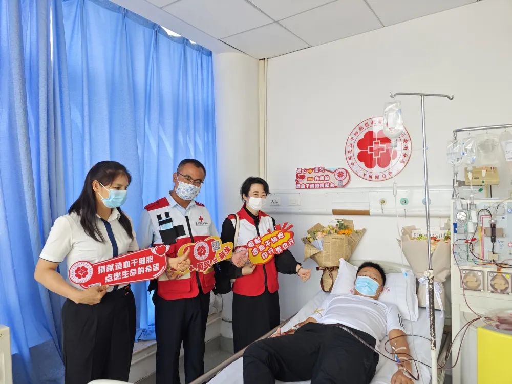 毕业后的他回到家乡建水,成为了一名光荣的人民教师。在此期间,他又多次参加无偿献血活动,2022年7月,在一次无偿献血活动中,他又看到了捐献造血干细胞知识宣传,他想起了十多年前就采集过血样,但至今却一直没有消息。工作人员告诉他,可能之前入库并未成功,有心想帮助别人的李老师又一次留下血样,这次他终于入库成功了。今年3月份,在入库不到一年的时间里,李老师就接到了初配成功的电话。当电话里红十字会的工作人员询问他是否愿意捐献干细胞的时候,他毫不犹豫地答应了。“我太开心了,因为我知道配型成功率很低,能够帮助到别人我很开心!”李老师说。当即,他就把这个消息告诉了当时正坐月子的爱人,李老师的爱人知道这是挽救生命的大事,为李老师能够有机会救人也让她备感欣喜。她完全支持李老师,让李老师赶紧去捐献。当工作人员告诉李老师,这只是初配成功,能不能捐献还要再进一步做高分辨检验和体检时,李老师心里又有点忐忑,深怕配不上。所幸,经过高分辨检验和体检,李老师符合捐献条件。当李老师把捐献造血干细胞的决定告诉家人和校方后,得到了全家人和校方的全力支持,并在5月26日得以成功捐献。红河州、建水县红十字会领导及建水一中教师代表到医院看望慰问。