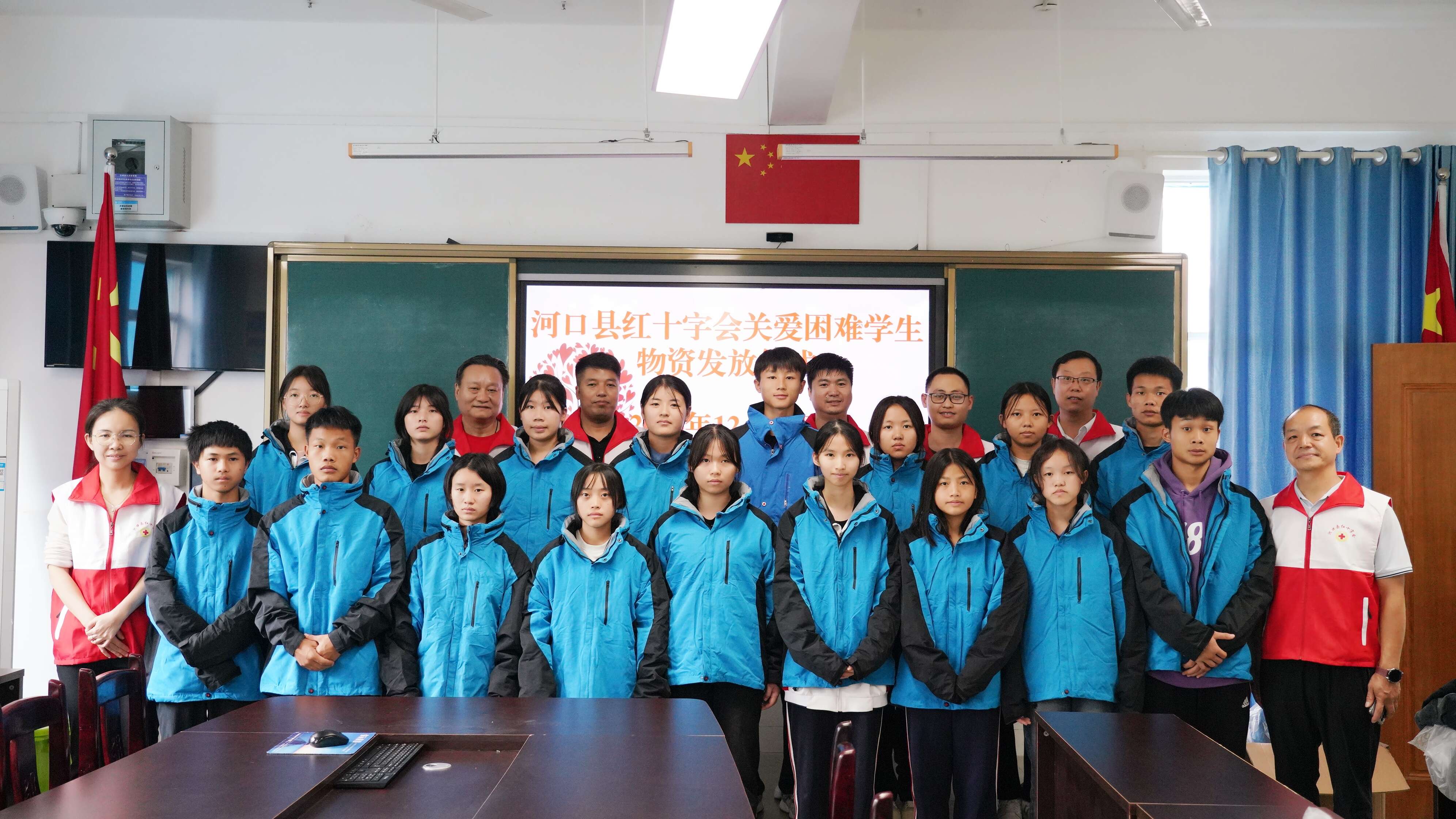 为弘扬“人道、博爱、奉献”的红十字精神,河口县红十字会组织滨河社区志愿者河口县高级中学走访慰问困难学生,并为20名贫困学生发放了价值3000元冲锋衣
