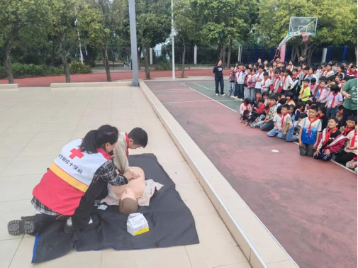 在应急救护知识宣讲环节,救护培训老师采用情景模拟互动教学方式,借助人体模型,生动细致地演示了“海姆立克急救法”和“心肺复苏(CPR)”的关键步骤与适用场景。“剪刀、石头、布,用力位置要精准”“手臂要伸直,用上身力量下压”“每30次胸外按压配合2次人工呼吸”老师一边清晰讲解操作要领,一边展示示范动作,师生们聚精会神,认真聆听。在科普志愿者的鼓励下,孩子们踊跃上台参与模拟演练,培训老师手把手指导,及时纠正动作细节,确保大家真正掌握基本的急救技能。
