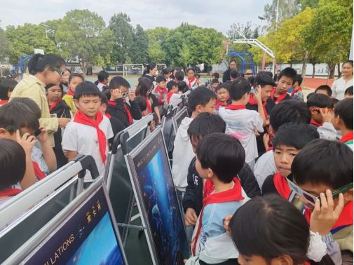 活动现场,“移动科技馆”成为孩子们关注的焦点。12套天文学3D展板带领同学们沉浸式遨游星空探索宇宙秘密;在科普讲解员的指引下,大家学习了星座的构成与传说。此外,9套互动展具让孩子们亲手操作,体验光、电、声、力等物理现象的奇妙原理。同学们或蹲或站,或独自思考或小组讨论,现场气氛活跃,充满了欢声笑语与好奇的目光,科学的种子在轻松愉快的氛围中悄然萌芽。