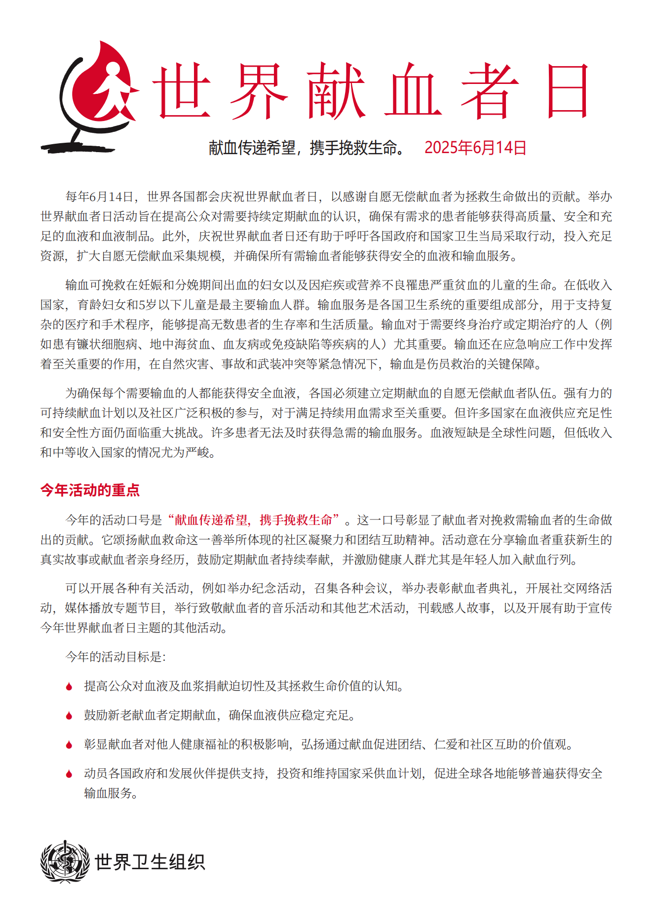 世卫组织发布2025年世界献血者日口号:献血传递希望,携手挽救生命