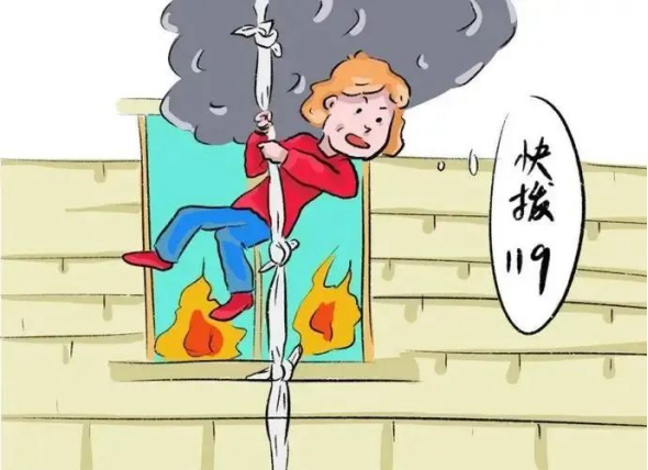 当大火已烧到身边,消防队员还没到达时,要及时利用建筑物内救援设备,如高空缓降器、救生绳等,缓慢降到楼下。