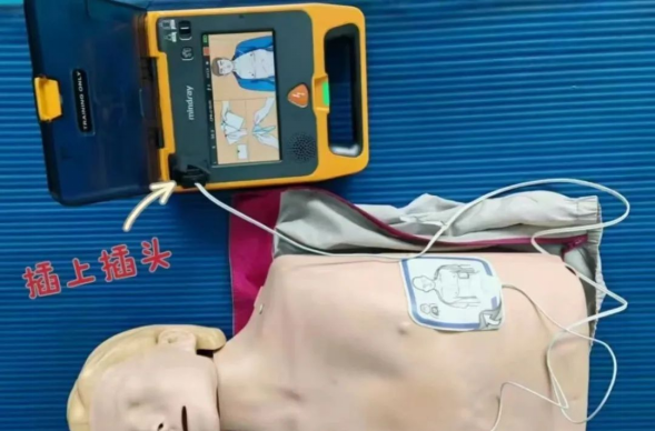 第四步:“连”(即连接主机)。有的AED需要插上插头,将电极片与主机连接;有的品牌AED已事先连接好,则可省略此操作。