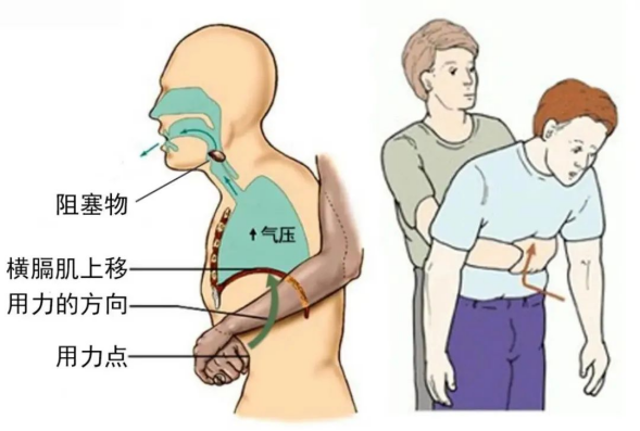 海姆立克法:施救者从患者身后将两臂环绕于患者腰腹部,一手握拳且将拳头的拇指侧对准患者上腹部,另外一手抓住拳头,连续快速向患者后上方冲击腹部,直到阻塞物排出。如果只有患者一人,可以椅子靠背等对准上腹部,靠身体向其挤压冲击直至异物排出。