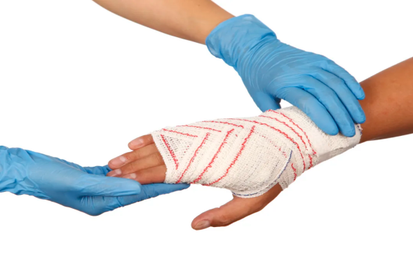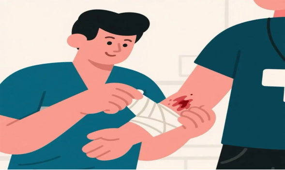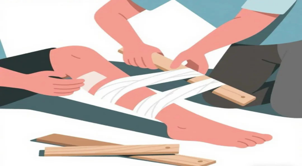 发现有人受伤时,快速、准确地用绷带、三角巾或者现场可以利用的其他材料包扎,是外伤救护的重要环节。