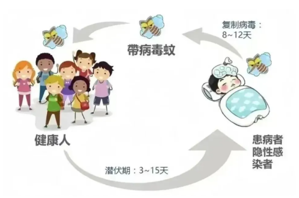 它通过“感染者→伊蚊→健康人”的途径不断传播,人与人之间不会直接传播。蚊子吸了感染者的血后,在体内复制病毒,下次咬人时把病毒传染出去。蚊子咬了感染者不会立即传播,要8~11天再叮咬才会传播。没有特定的易感人群,各年龄段人群普遍易感。