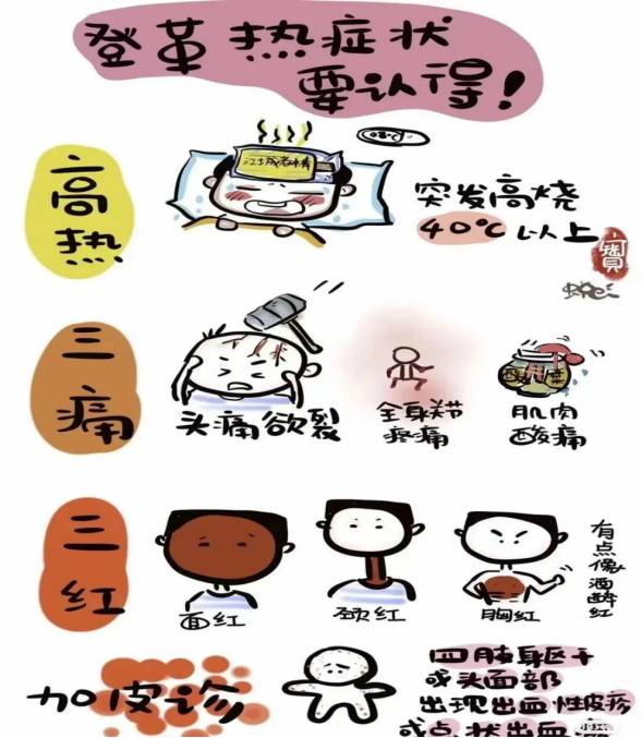 “三痛”:剧烈头痛、眼眶痛、关节肌肉疼痛等。