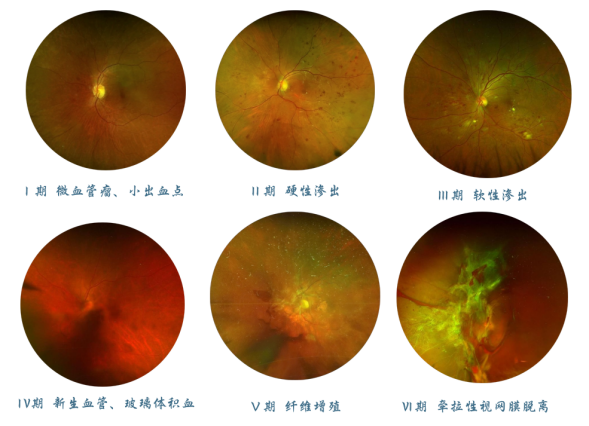 我们如何抓住治疗机会呢?这就需要了解一下“糖网”发展的整个过程。在糖尿病早期,眼底是正常的。但随着病情的进展,就会逐渐出现视网膜病变。糖网病程可以分为6期。I期时,视网膜上有微血管瘤和散在的出血点的出现,此时需要严格控制全身病,让血糖保持稳定,并且要密切随访。如果控制不理想,就会发展到II期,出现脂性物质渗出,在视网膜上会看到一些黄白色的小斑点,也称“硬性渗出”。进一步发展,就出现像棉花团状的白色斑片“软性渗出”,这是视网膜细胞缺血缺氧的一种表现,看到棉绒斑就到了III期。前面三期都是非增殖期,还没有新生血管产生,但是可能会有黄斑水肿或者视网膜无灌注区,这都是缺血缺氧导致,这一阶段可以进行玻璃体腔注药或者激光治疗来控制病程。IV期时,视网膜会有新生血管形成,这些异常的血管极易破裂出血或者渗血,就是我们所谓的眼底出血。若形成大量玻璃体积血,视力就会严重下降,仅有指数或手动。此时,必须抓紧时间治疗,可能需要玻璃体腔注药、视网膜激光光凝或者玻璃体手术。如果仍旧置之不理,视网膜前就会因为炎症、出血机化等原因形成增殖膜,就到了V期;纤维增殖膜牵拉视网膜会造成牵拉性视网膜脱离,就像墙皮被扯掉了一样,就会导致失明,糖网就进入了VI期,这一阶段必须手术治疗。IV期到VI期都属于增殖性糖尿病视网膜病变,一旦进入这个阶段,就说明病变很严重了,必须严密观察,积极治疗,可以通过玻璃体腔注药、激光或者手术来有效控制病情,维持有用视力。但是很多患者依然没有好好控制,最后可能继续进展而发生继发新生血管性青光眼,不仅视力丧失,而且会因为难以控制的高眼压而痛苦不堪。