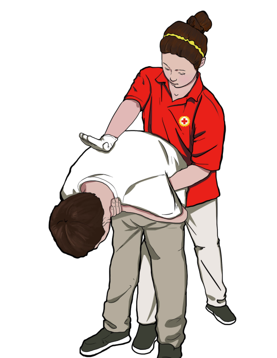 施救者站在患者身后,用一只手支撑患者胸部,让患者弯腰。