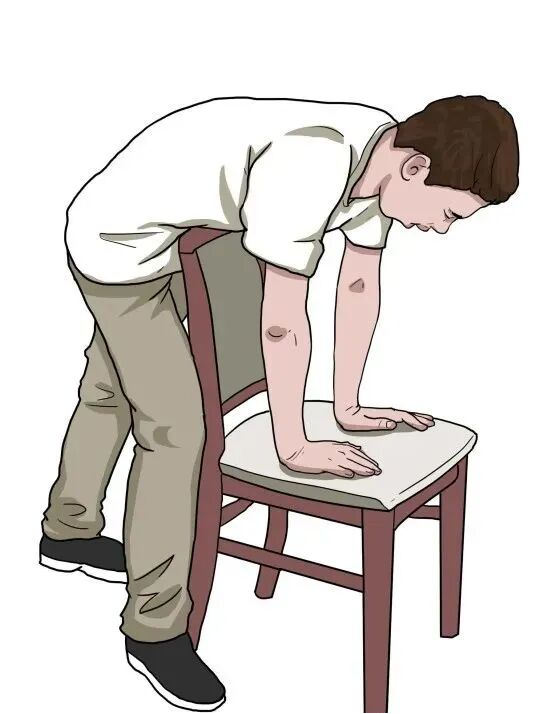 如果不能做腹部冲击,立即寻找椅背或桌边等坚硬的支撑物。将上腹部抵在椅背、桌缘等处,弯腰连续向内、向上冲击。