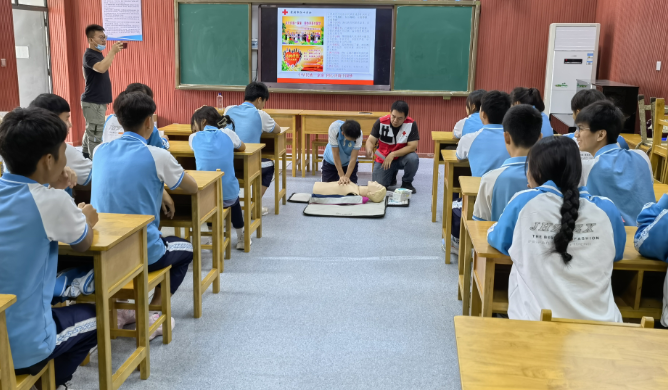 弘扬生命理念,普及健康知识。向师生们讲解红十字运动由来、红十字会标志、心肺复苏、防灾避险和政策法规等理论知识。组织参与活动师生实操心肺复苏术,重点体验按压环节操作流程以及注意事项。