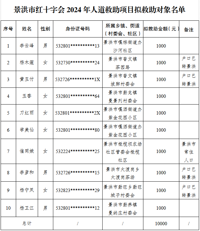 景洪市红十字会2024年人道救助项目拟救助对象名单公示 (第三期)