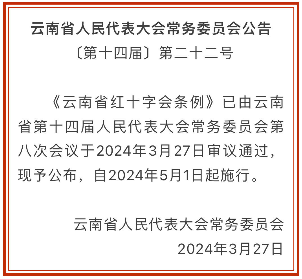 第四十五条 本条例自2024年5月1日起施行。1996年7月24日云南省第八届人民代表大会常务委员会第二十二次会议通过的《云南省红十字会条例》同时废止。