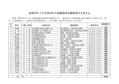 昆明市红十字会2019年11月人道救助基金救助项目人员公示