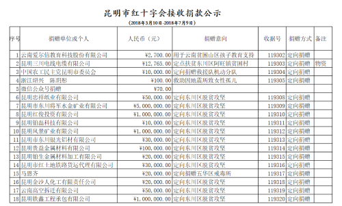 2018年昆明市红十字会接收捐款公示