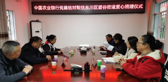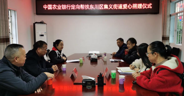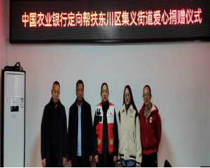 12月25日,中国农业银行昆明东川区支行党建结对帮扶东川区碧谷街道、定向帮扶集义街道爱心捐赠仪式在区红十字会举行。仪式由区红十字会党组书记、常务副会长桂敏主持,中国农业银行昆明东川区支行、碧谷街道办事处、集义街道办事处相关领导出席。