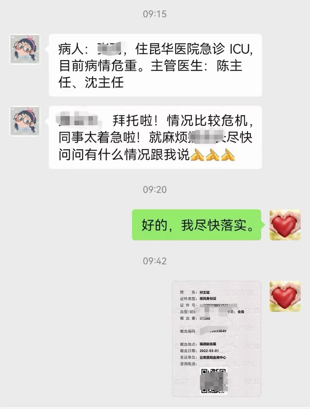 2023年3月29日9:15,官渡区红十字会收发了一条急需用血信息,官渡区红十字会志愿服务队祁文斌积极响应,连发三张献血证,满足急救病人用血需求。他表示:“作为志愿者,无偿献血是我力所能及、义不容辞的事,一方面希望能够挽救病人的生命,另一方面也希望通过这样的举动,感动身边人,让更多人参与到无偿献血的志愿活动中来。”他还表示自己会一直保持健康饮食并加强体育锻炼,以时刻符合献血标准的状态等待着为他人生命“续航”的机会。