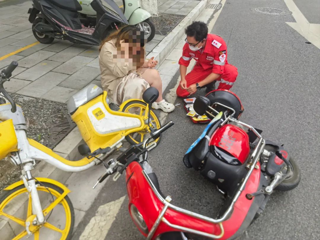 近日,昆明红十字救援队搜救大队队员杨彦尧途经昆明五一路,目击两辆电动车发生追尾事故,现场一人受伤。杨彦尧第一时间上前询问,在表明红十字急救员身份,取得伤员同意后,他立即进行了专业的伤情评估,经查验,发现伤员腿部有多处擦伤。