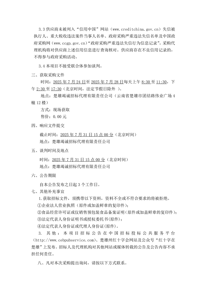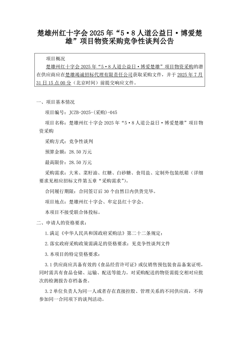 楚雄州红十字会2025年"5·8人道公益日·博爱楚雄"项目物资采购竞争性谈判公告