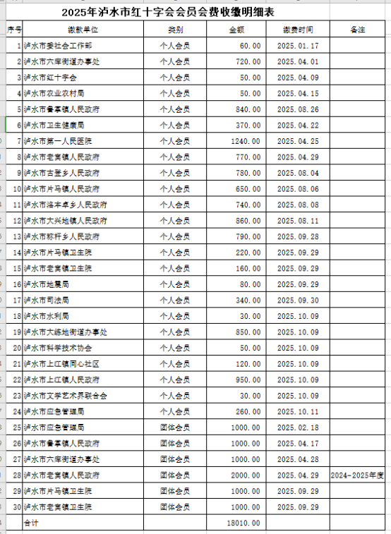 按照《中华人民共和国红十字会法》《中国红十字会章程》《中国红十字会会员管理办法》和《中国红十字会会费管理办法》相关规定,泸水市红十字会依法招募会员,并收缴2025年会费。截止2025年12月25日,共收缴会费18010元,现将具体收支明细公示如下: