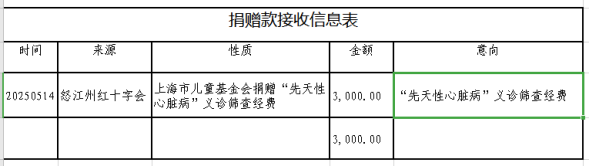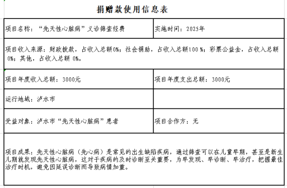 会下拨“先天性心脏病”义诊筛查经费3000元(叁仟元整),5月28日已专项用于开展先心病筛查工作,现按规定予以公示。