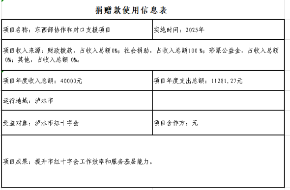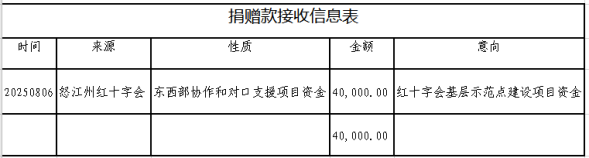 慈善法》《中华人民共和国红十字会法》《中国红十字章程》的相关规定,市红十字会为保证款物募捐过程公开,让更多捐献者放心、安心,2025年8月6日我会接收怒江州红十字会下拨东西部协作和对口支援项目资金40000.00元(肆万元