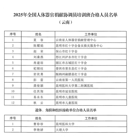 为深入贯彻落实《人体器官捐献和移植条例》《关于促进人体器官捐献工作健康发展的意见》和《人休器官捐献协调员管理办法》,进一步加强人体器官捐献协调员队伍建设,中国人体器官捐献管理中心于2025年10月20日-24日在重庆市举办第45期全国人体器官捐献协调员培训班,泸水市红十字会专职副会长刘桑燕参加了此次培训,通过层层考核,最终取得了合格证书。