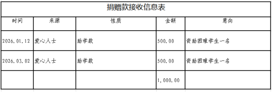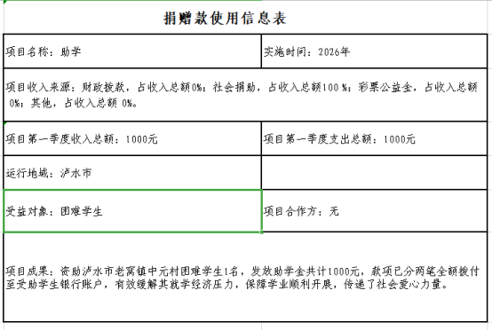 泸水市红十字会于2026年1月12日、3月2日分别接收爱心人士捐款,共计1000元,专项用于资助泸水市老窝镇中元村一名困难学生。资助标准为每季度500元,相关助学款已于2026年1月14日、3月3日分别拨付至受助学生银行账户。
