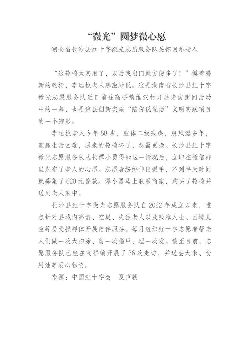 湖南省长沙县红十字微光志愿服务队关怀困难老人