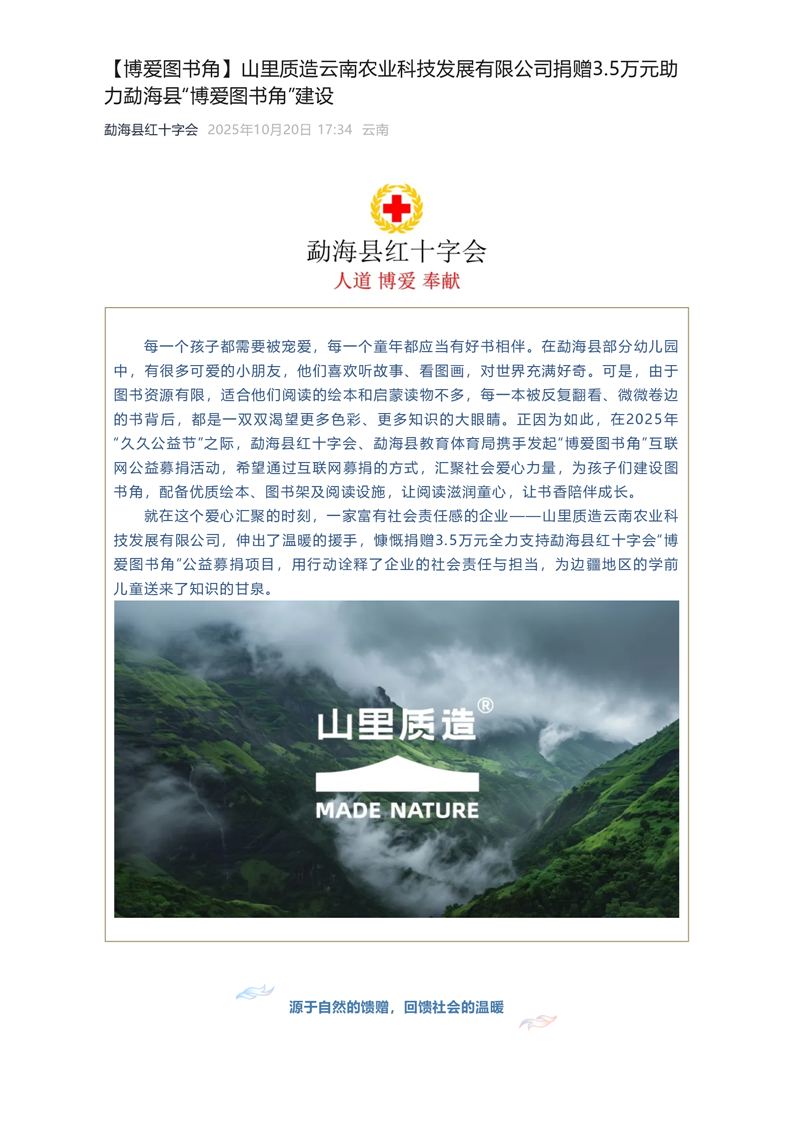 【博爱图书角】山里质造云南农业科技发展有限公司捐赠3.5万元助力勐海县“博爱图书角”建设