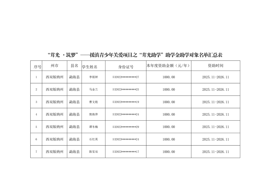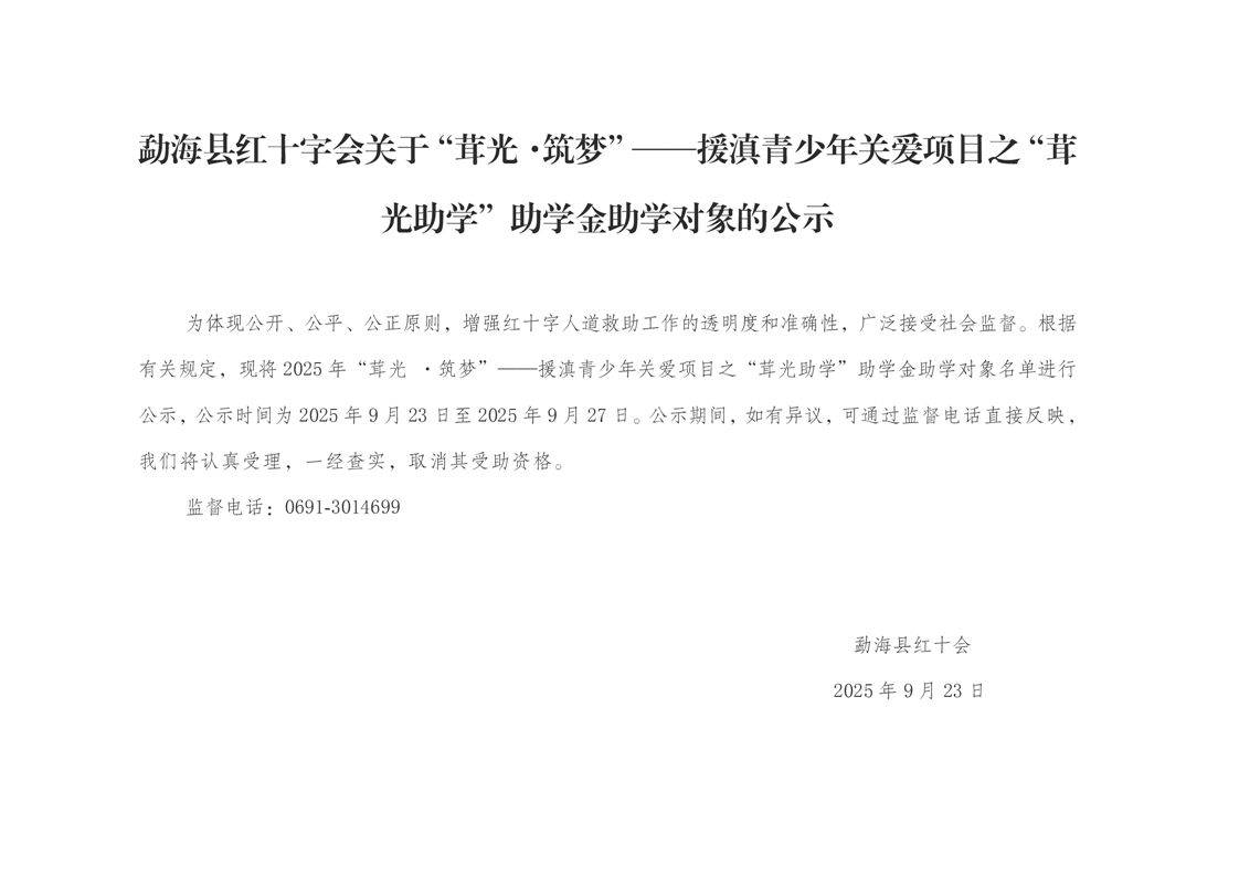 勐海县红十字会关于“茸光·筑梦”——援滇青少年关爱项目之“茸光助学”助学金助学对象的公示